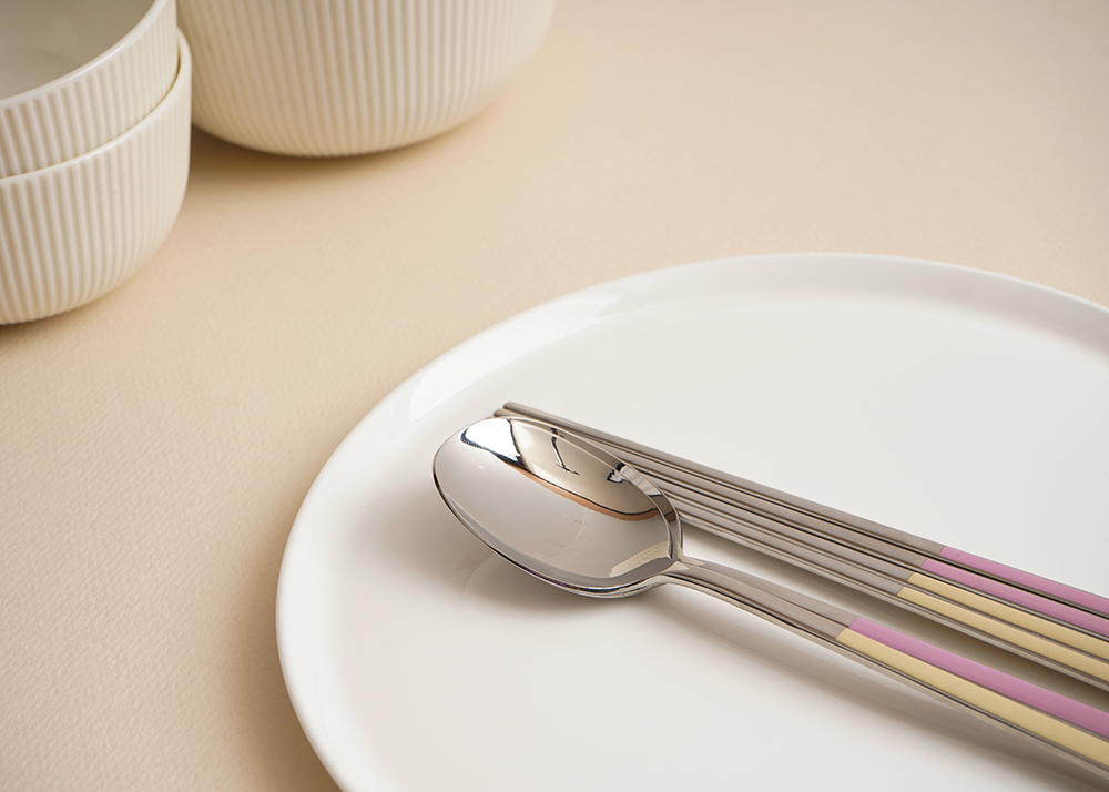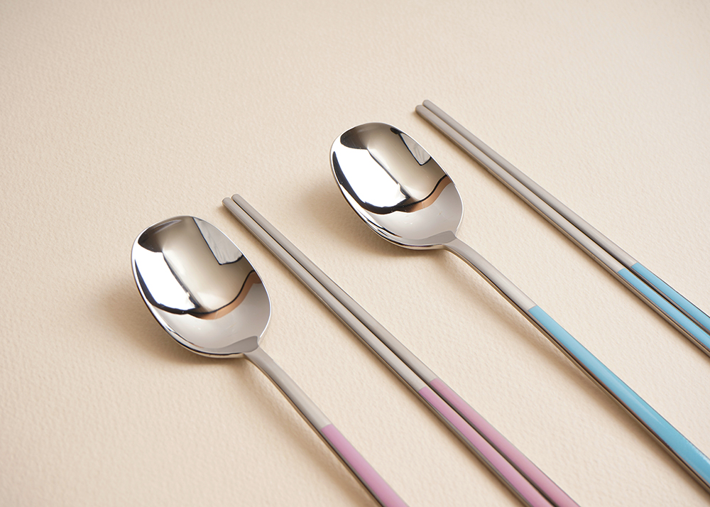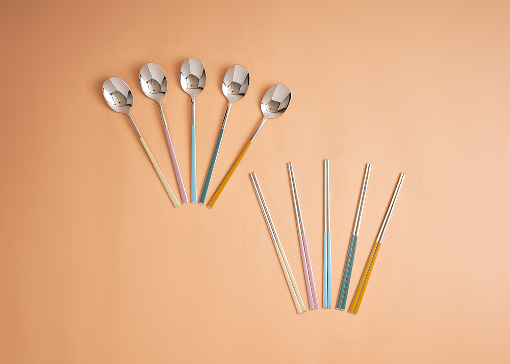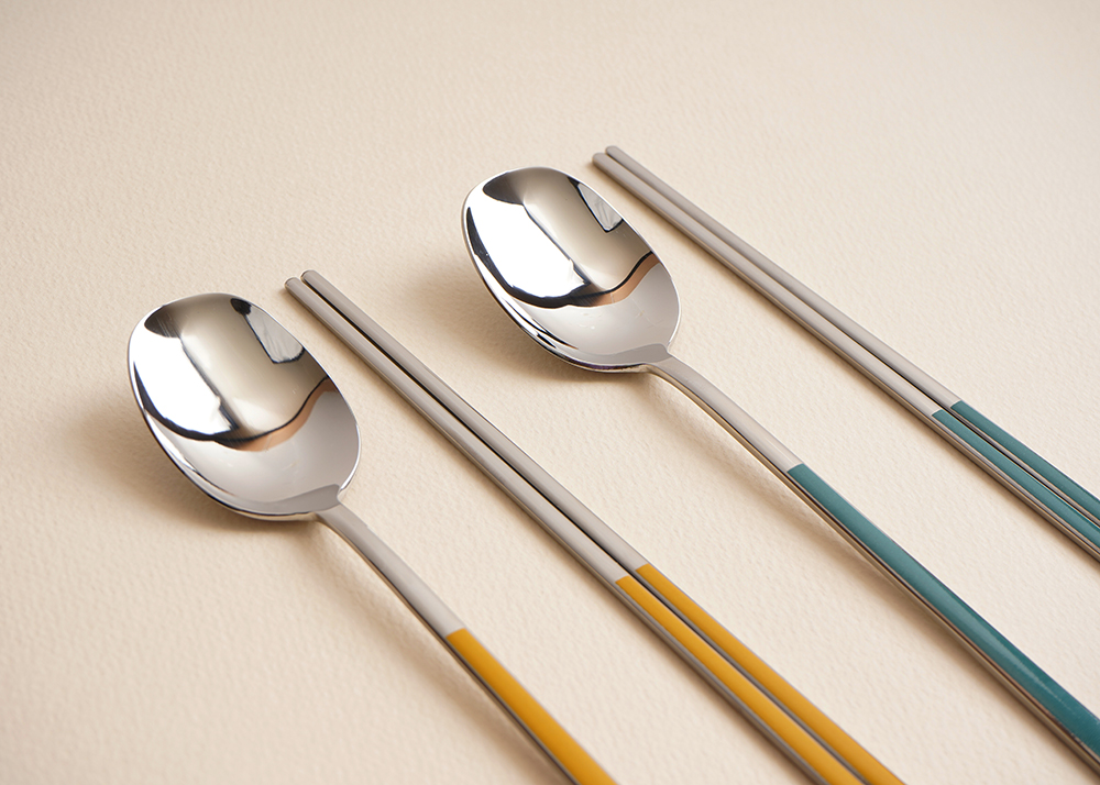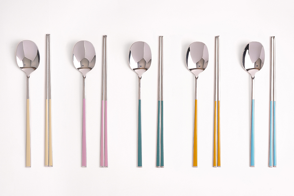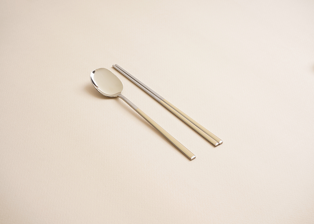 유광 처리된 육각 형태의 스텐에 세라믹을 입혀 깔끔하고 모던한 수저 세트 입니다. 적당히 가벼운 무게감으로 손이 매우 편하고 한식 테이블에 아주 적합한 디자인 입니다.