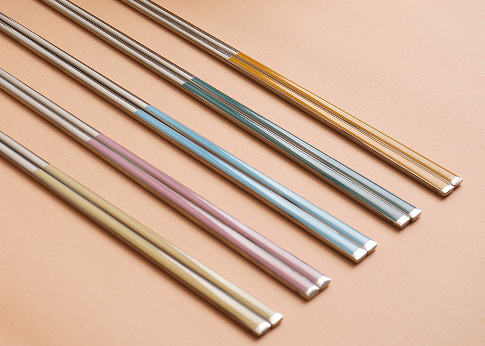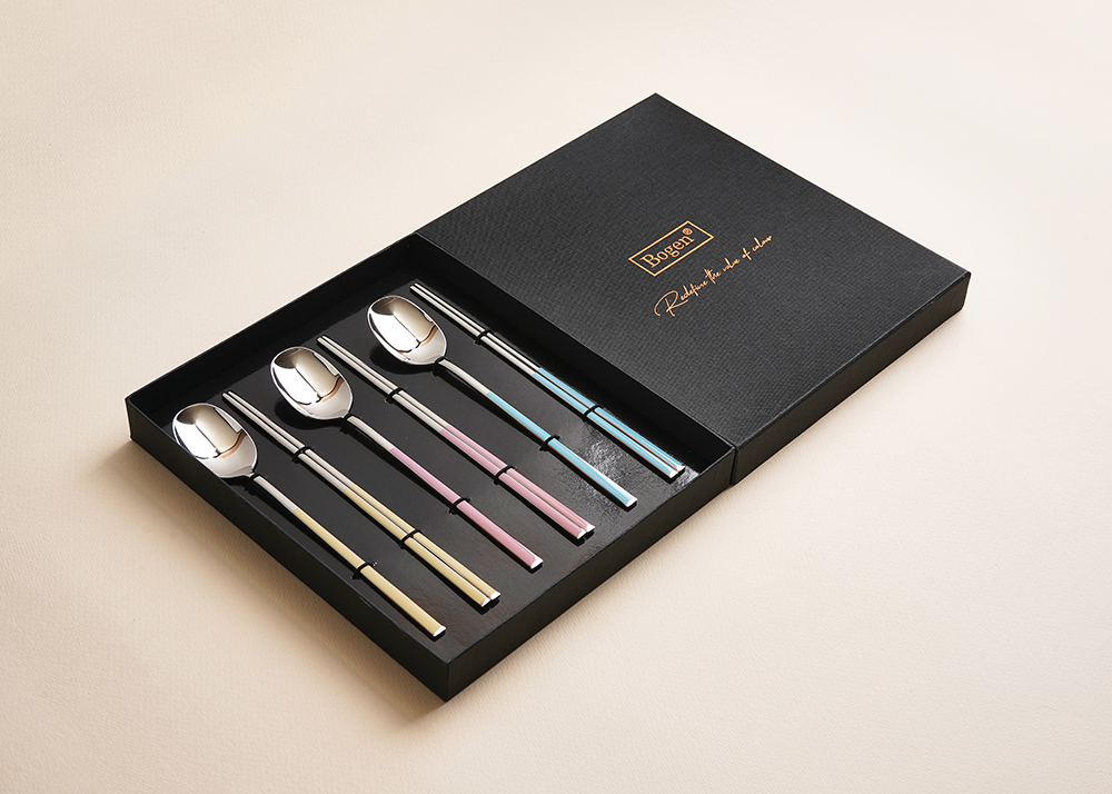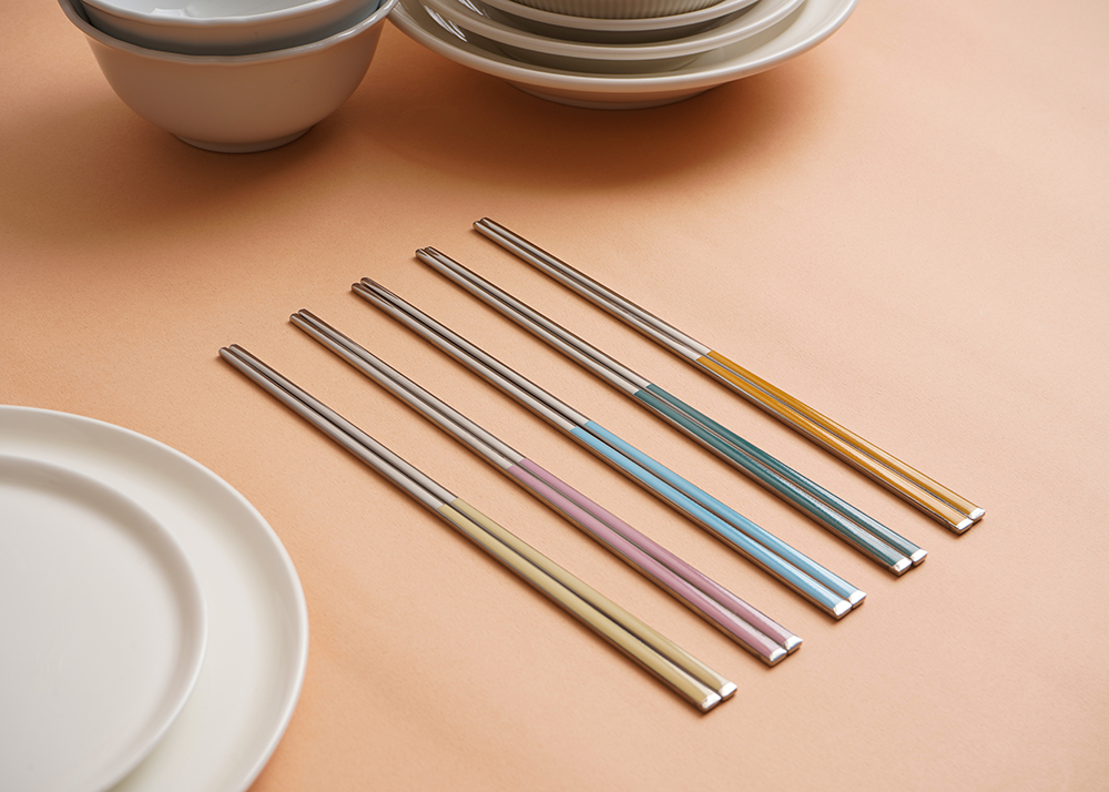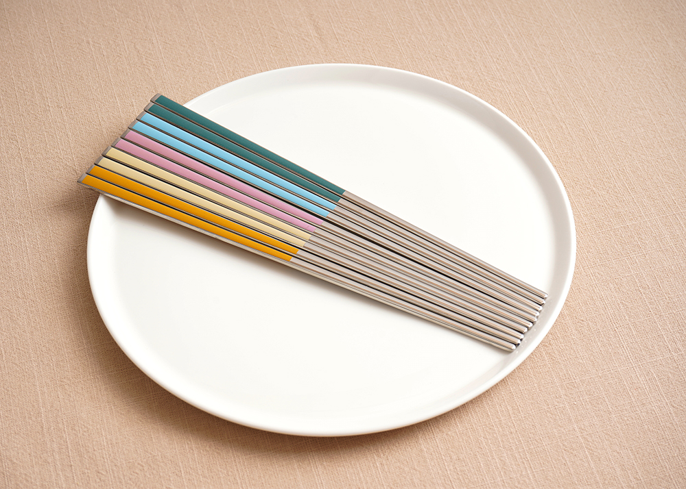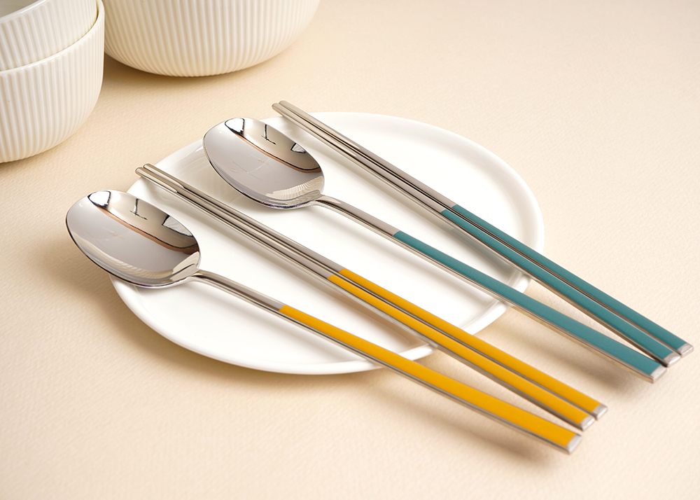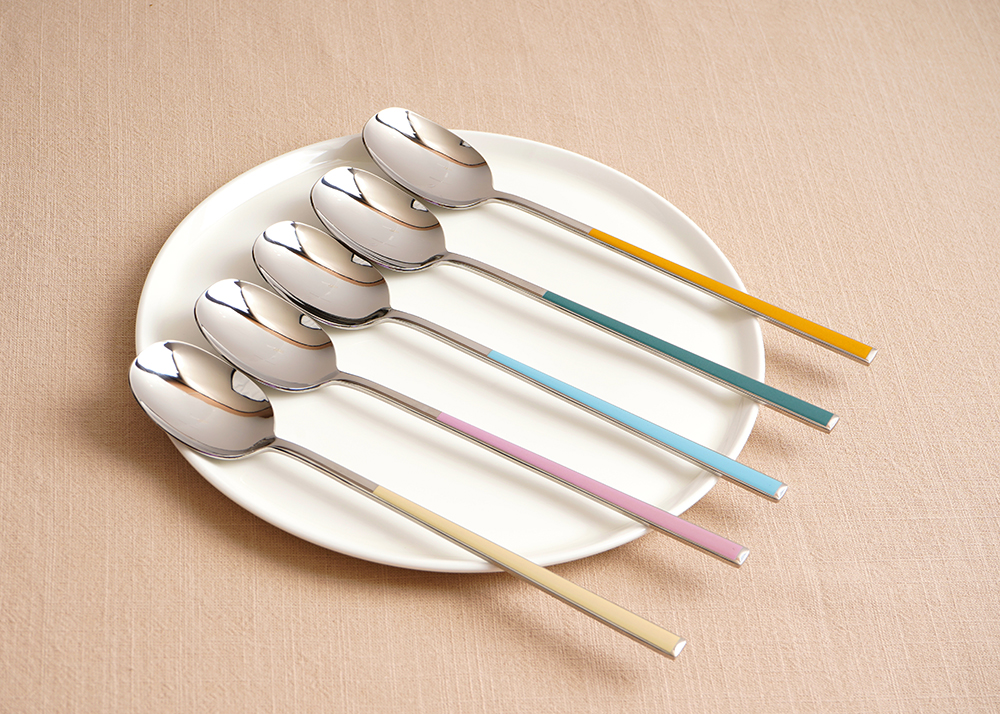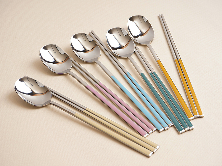 유광 처리된 육각 형태의 스텐에 세라믹을 입혀 깔끔하고 모던한 수저 세트 입니다. 적당히 가벼운 무게감으로 손이 매우 편하고 한식 테이블에 아주 적합한 디자인 입니다.