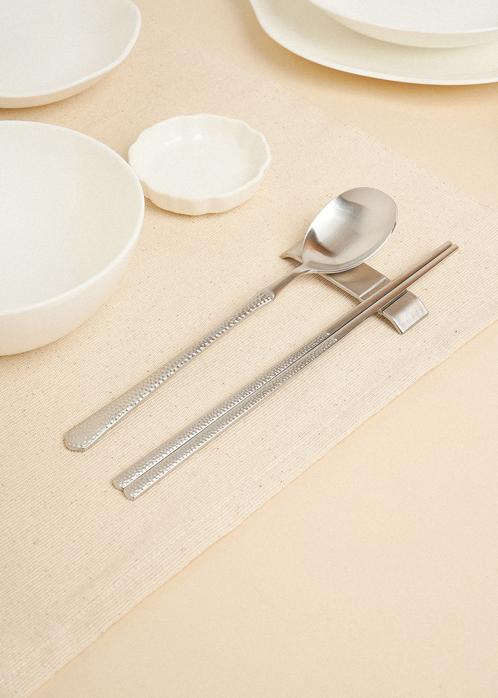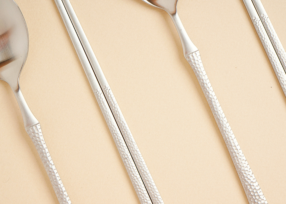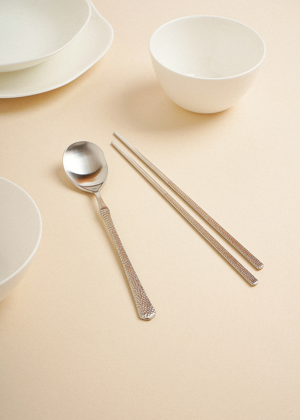 부드러운 곡선 쉐입과 망치로 두들긴듯한 독특한 텍스쳐로 굴곡에 따라 반짝이는 핸들이 특징인 루체 수저 세트