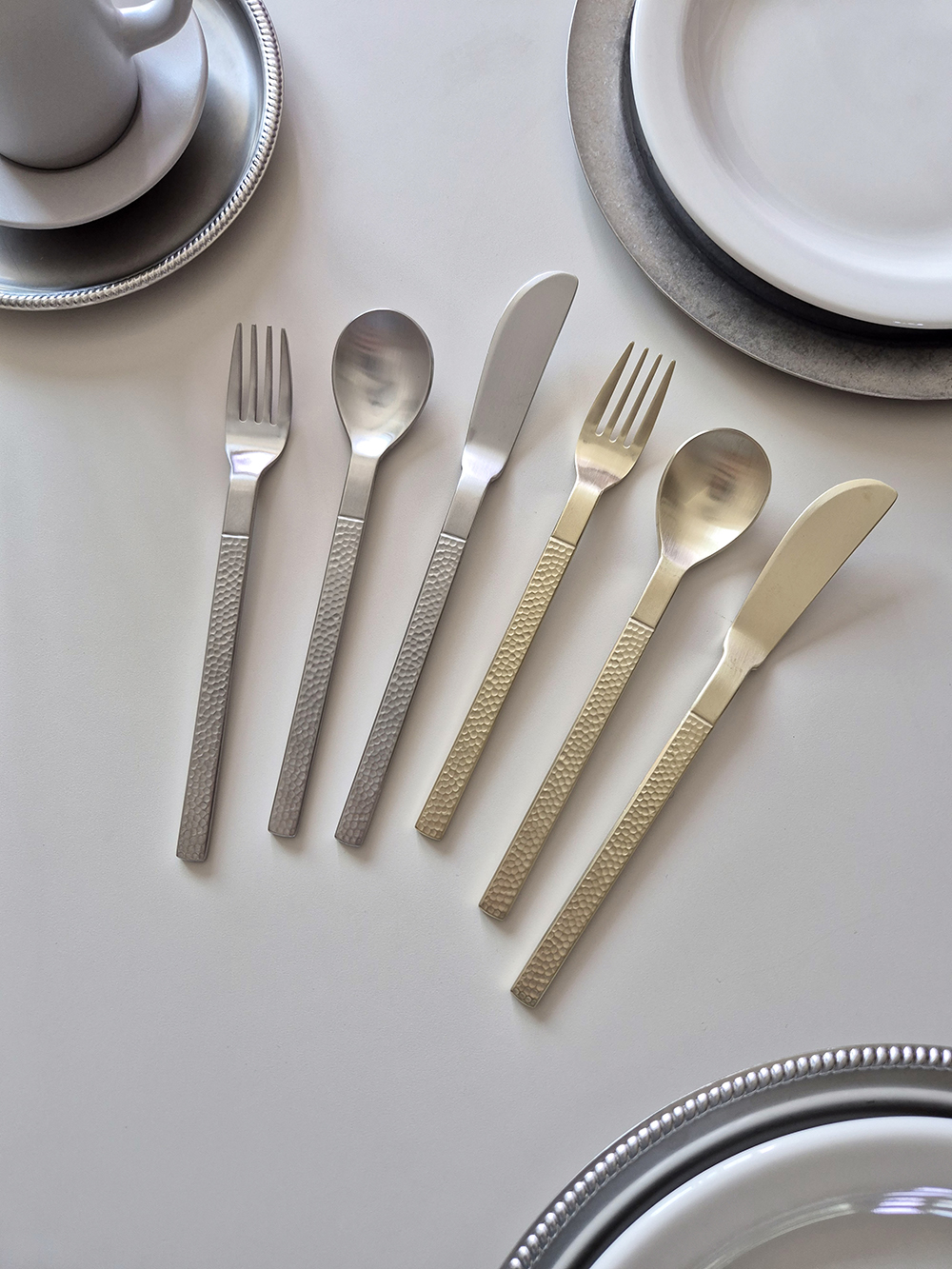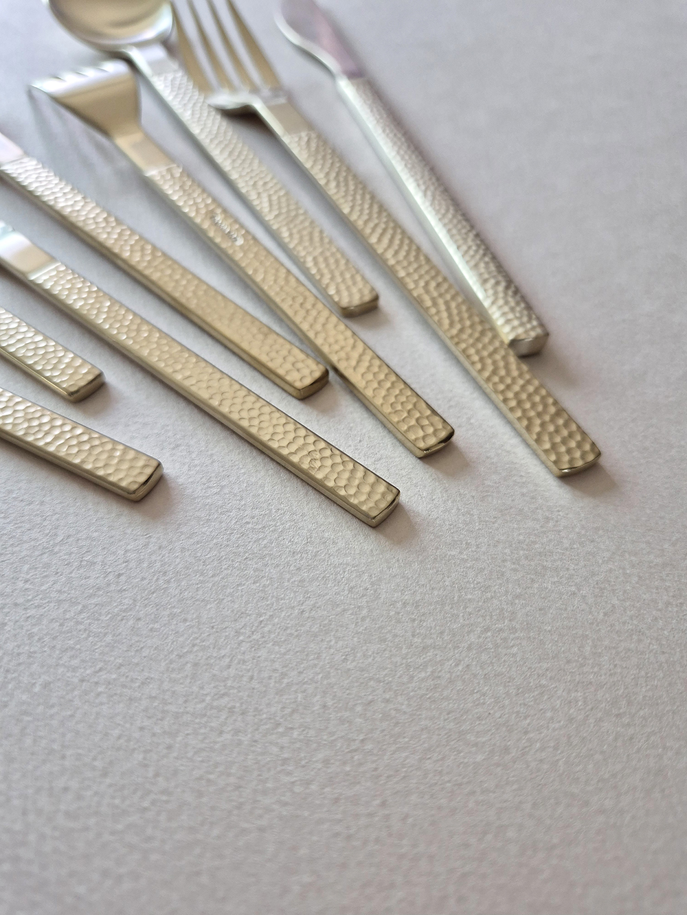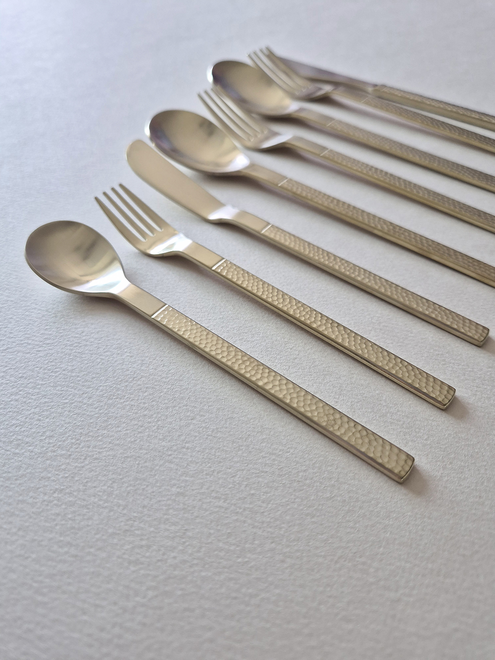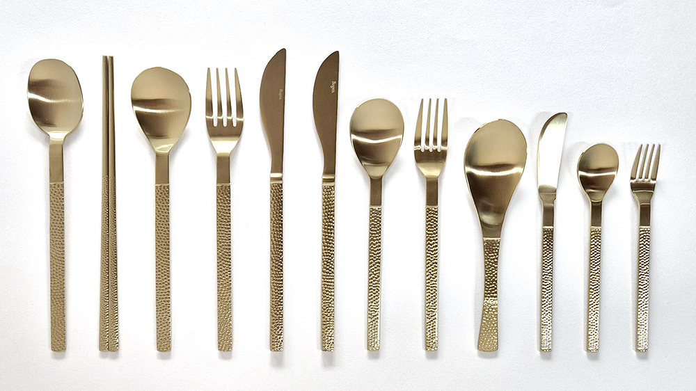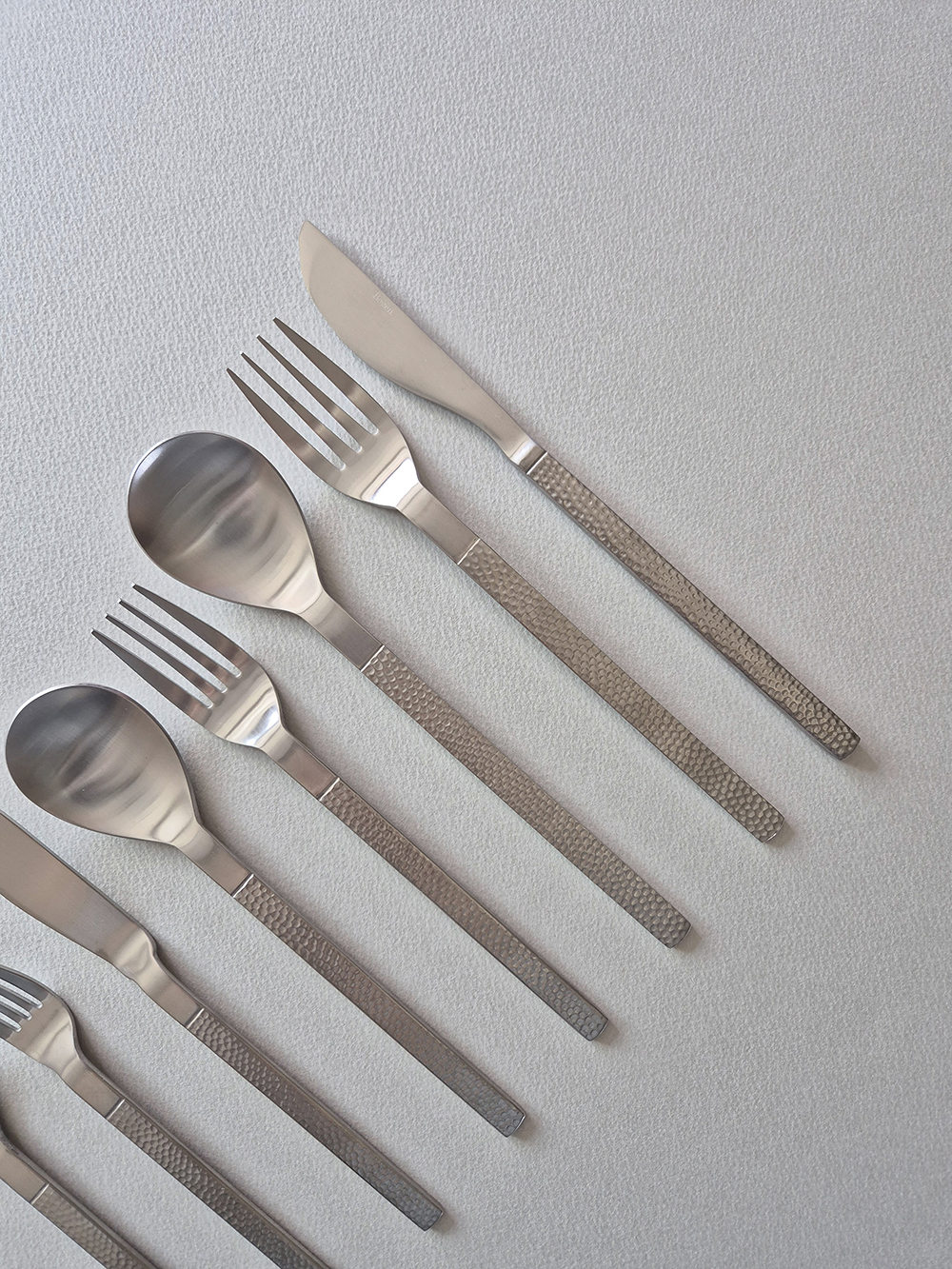 유행타지 않는 해머드 텍스쳐와 심플한 직사각 쉐입으로 디자인된 군더더기 없는 세련된 타임리스 커트러리 입니다.