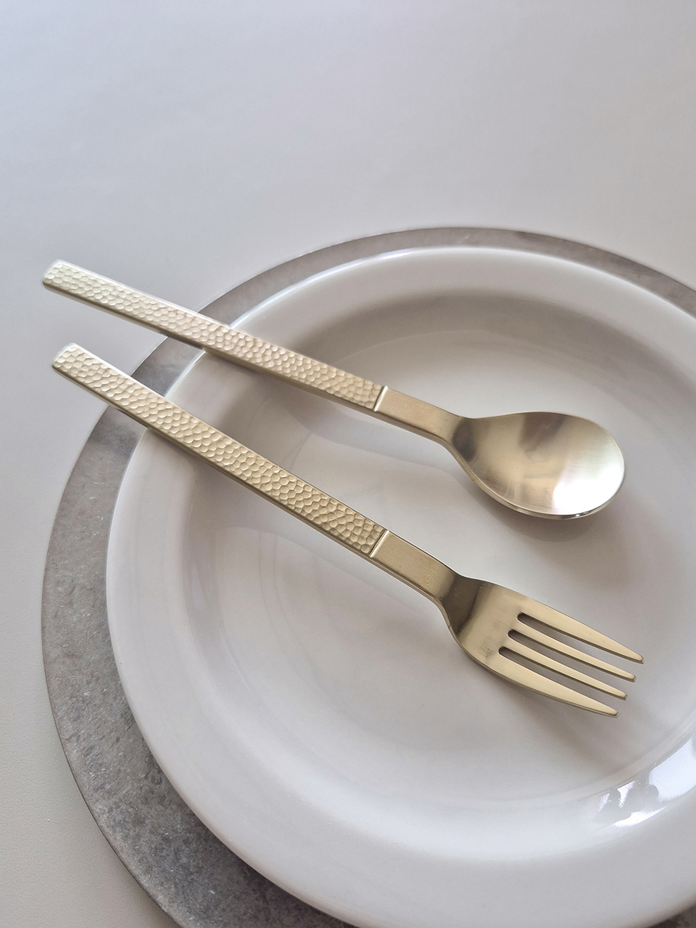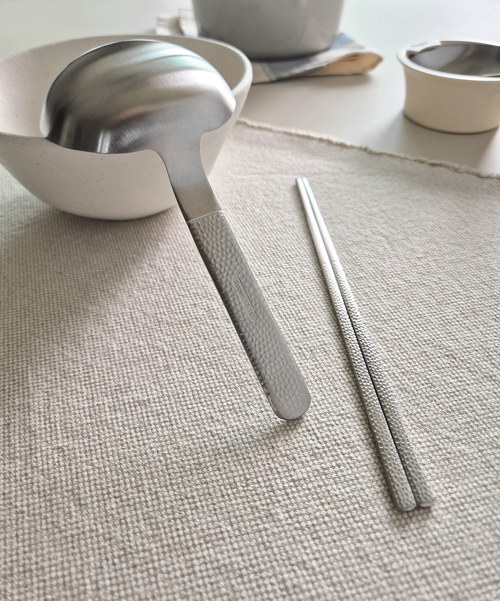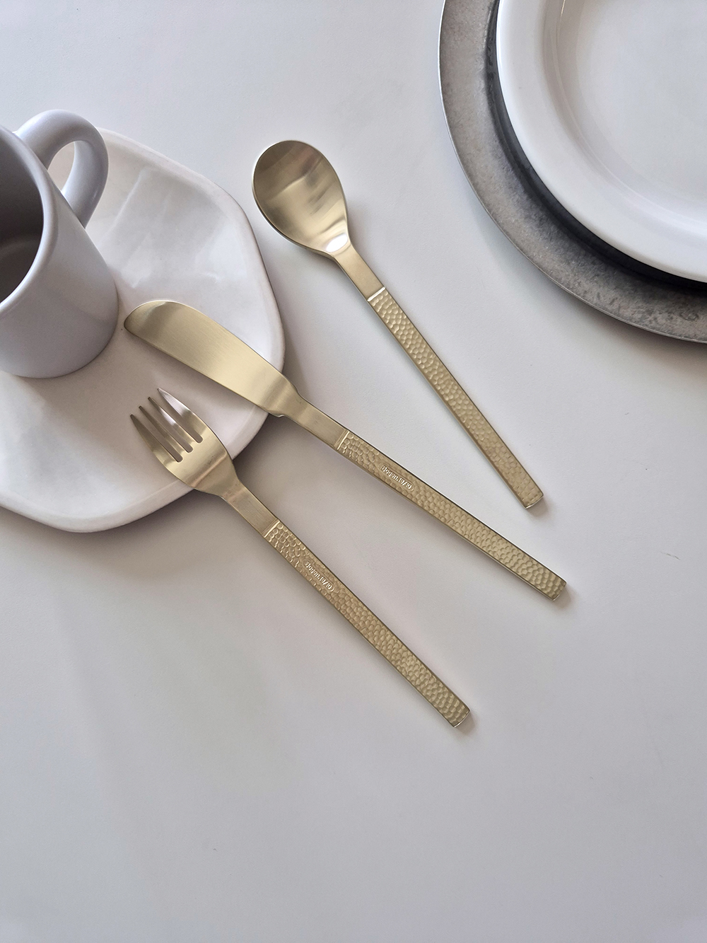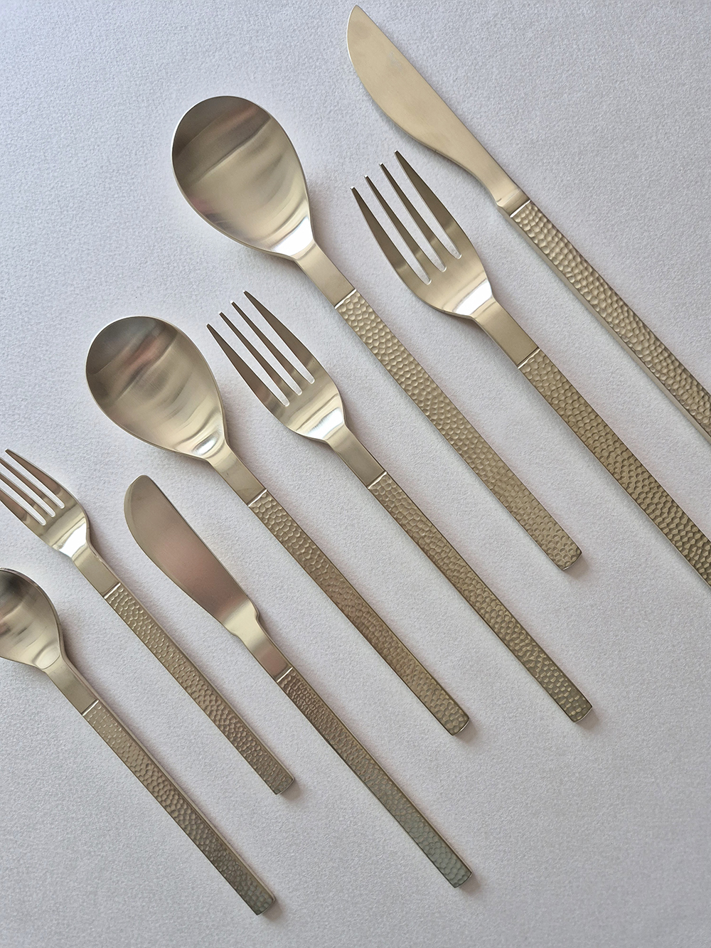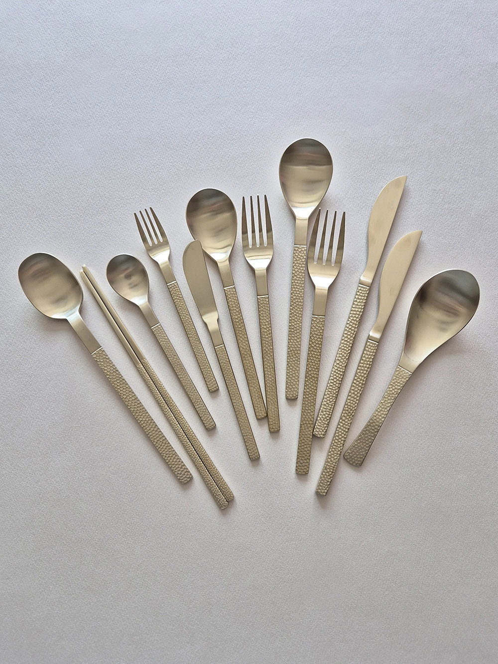 유행타지 않는 해머드 텍스쳐와 심플한 직사각 쉐입으로 디자인된 군더더기 없는 세련된 타임리스 커트러리 입니다.