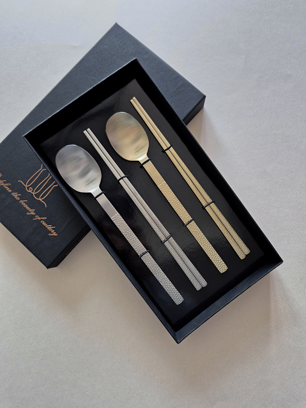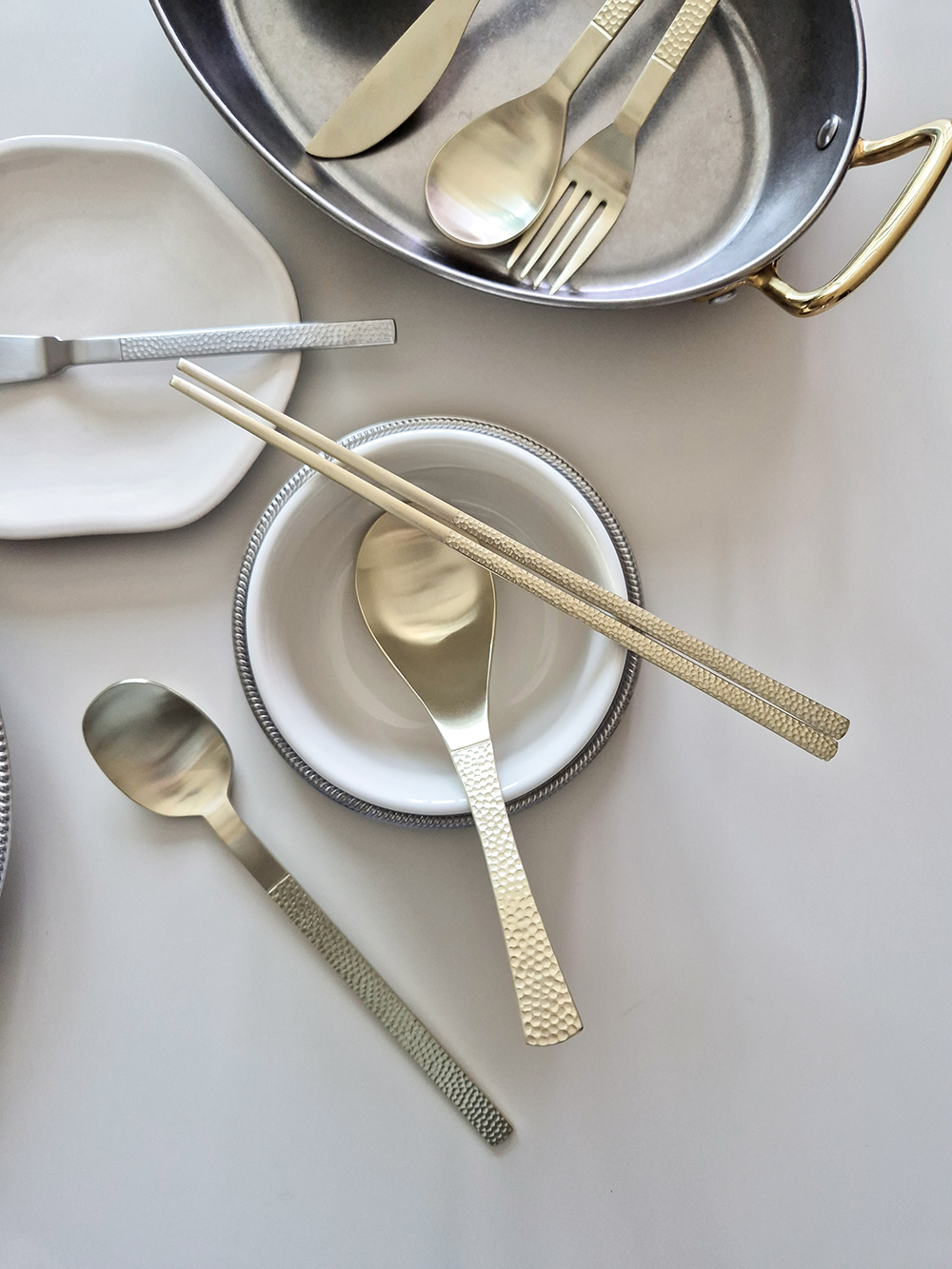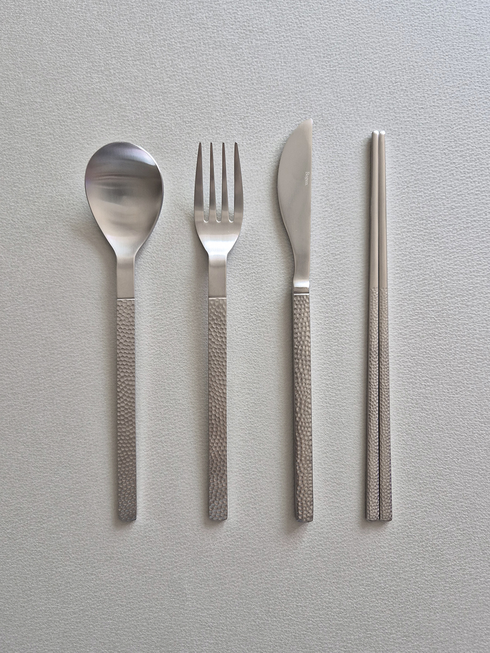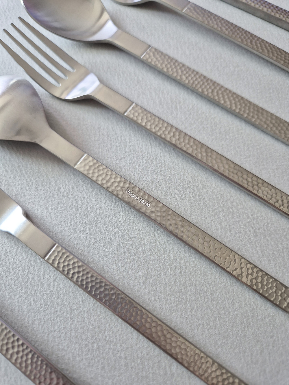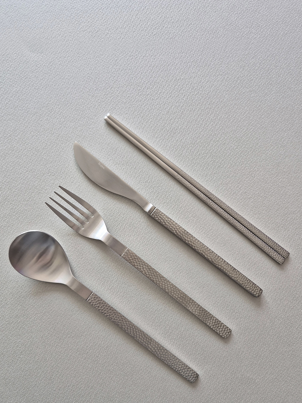 유행타지 않는 해머드 텍스쳐와 심플한 직사각 쉐입으로 디자인된 군더더기 없는 세련된 타임리스 커트러리 입니다.