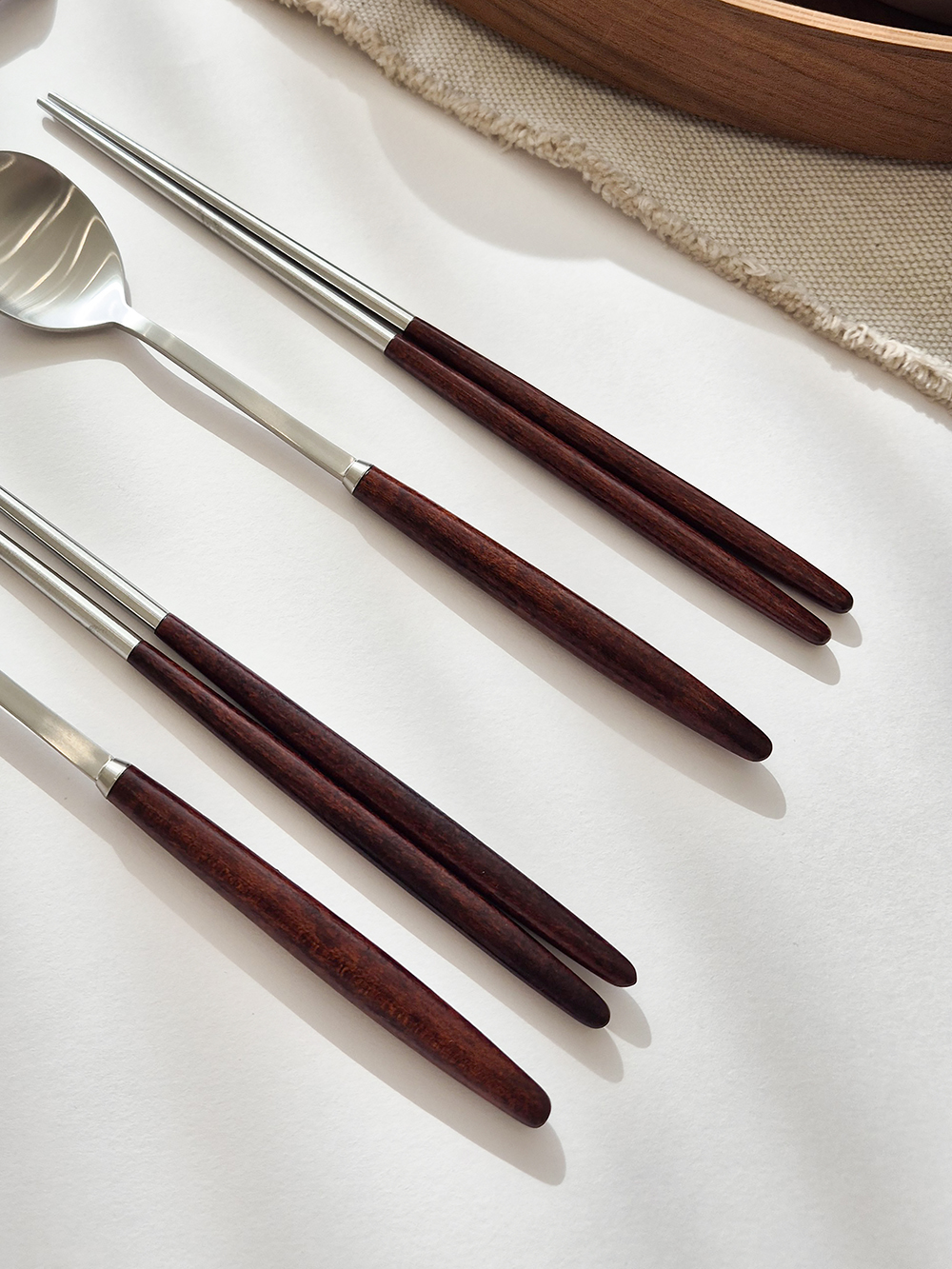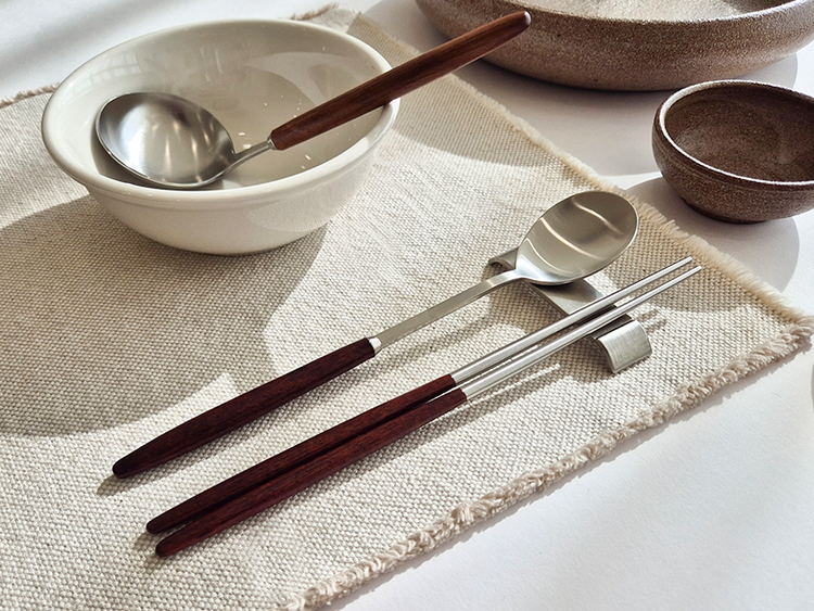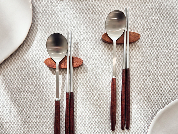 수저의 목 부분이 길게 디자인 되어 한식 문화에 사용하기 매우 편리하고 원목 핸들 부분은 적당한 두께로 그립감이 좋습니다.