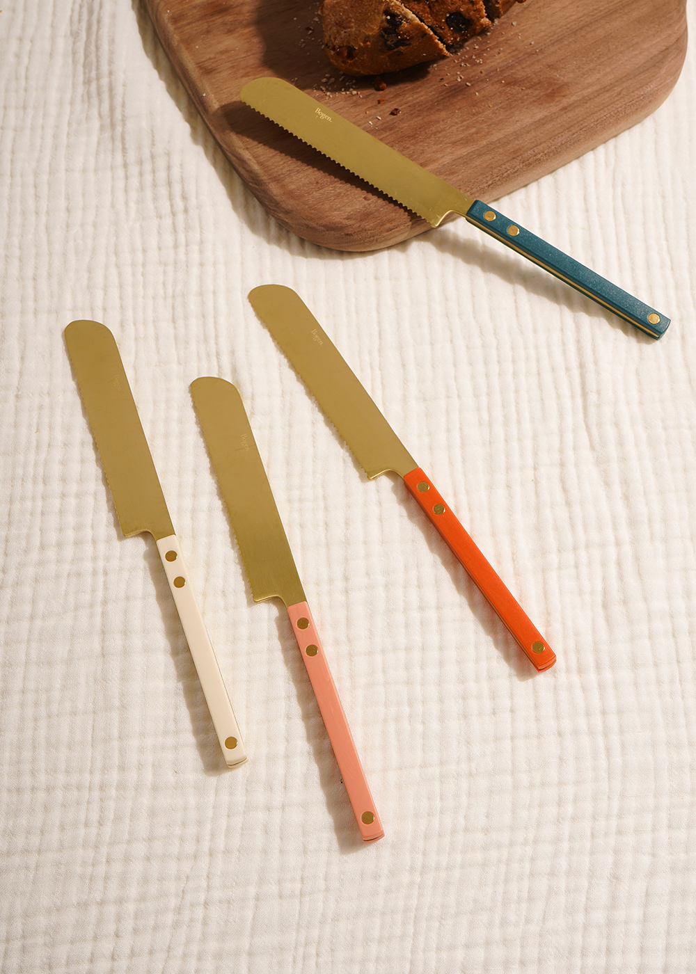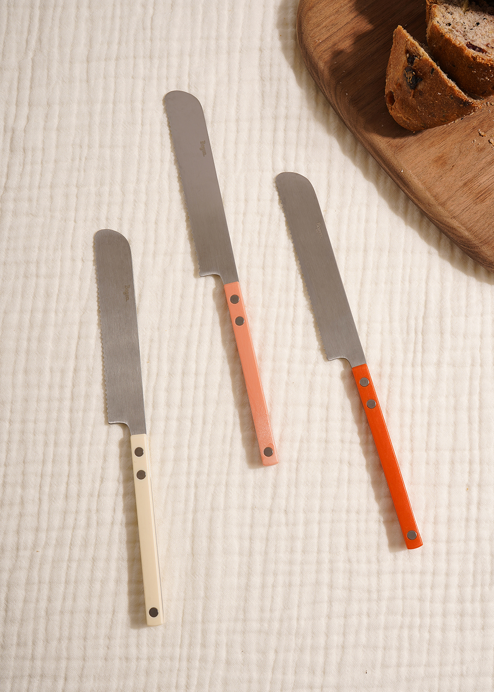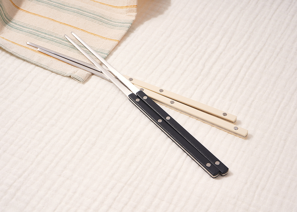 나이프류(디너나이프, 브레드나이프, 치즈나이프)는 SUS420J2(철 성분) 재질로 만들어지며 이 재질은 고경도를 요하는 기계 부품류, 계측기용 및 Knife류에 주로 사용되며 내마모성이 좋고, 강자성체로 열처리를 통해 경화되어 Knife류에 가장 적합한 재질입니다.